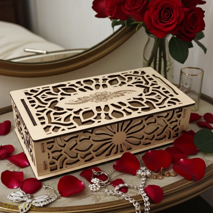 Objevte krásu a eleganci s naší ručně vyráběnou dřevěnou šperkovnicí z pevné bukové překližky o síle 3 mm. Díky technice precizního gravírování (vypalování do dřeva) získává každý kus originální a jedinečný design, který dokonale podtrhne vaši sbírku šperků.