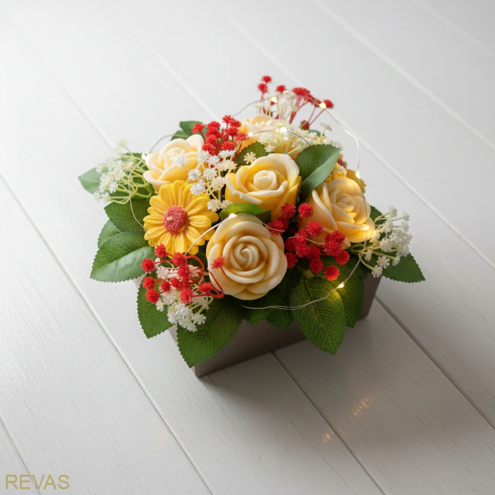 Objevte kouzlo ručně vyráběné dárkové kytice ze svíček ve tvaru růží, kopretin a dalších květin. Každý květ v této neobyčejné kytici je pečlivě odlitý z palmového vosku a propracovaný do nejmenšího detailu – od okvětních lístků až po barevné kombinace, které působí jako skutečné květiny.