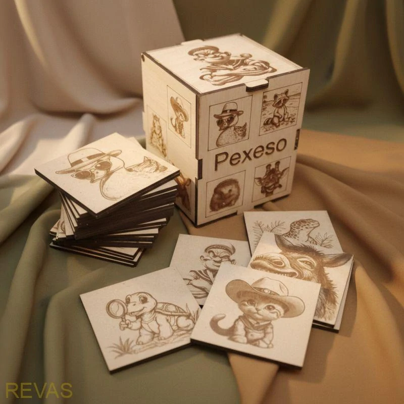 Pro snadné uschování a ochranu před ztrátou jednotlivých dílků je pexeso uloženo v krásné gravírované dřevěné krabičce, která zároveň slouží jako stylový doplněk a ideální dárek pro malé i větší děti.