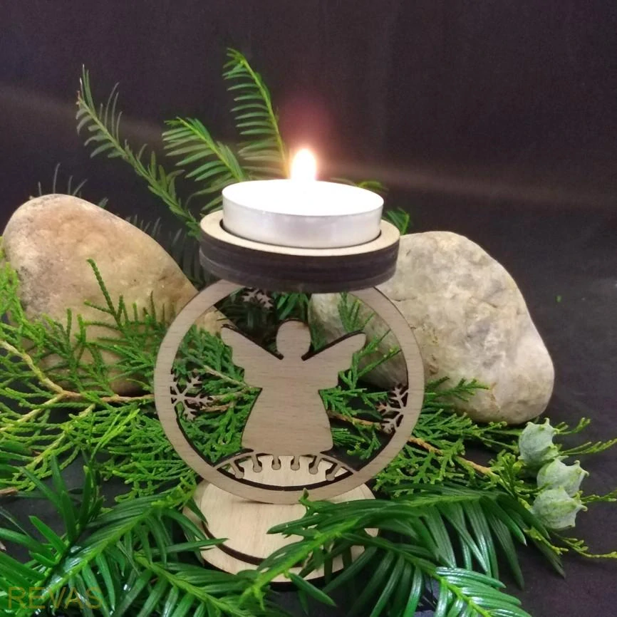 Elegantní dřevěný svícen z 3mm bukové překližky s vánočním motivem, výška 9 cm, průměr spodní části 6 cm, vrchní 5 cm. Precizní gravírování a prostor pro jednu čajovou svíčku vytvoří kouzelnou vánoční atmosféru. celý popis