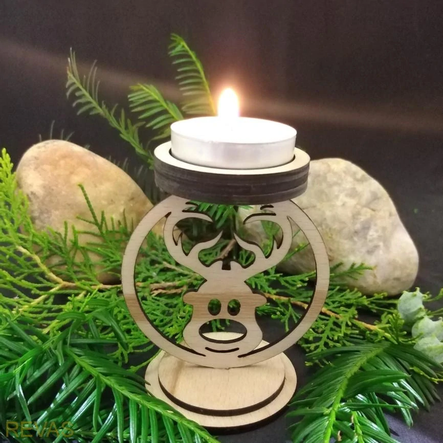 Elegantní dřevěný svícen z 3mm bukové překližky s vánočním motivem, výška 9 cm, průměr spodní části 6 cm, vrchní 5 cm. Precizní gravírování a prostor pro jednu čajovou svíčku vytvoří kouzelnou vánoční atmosféru. celý popis