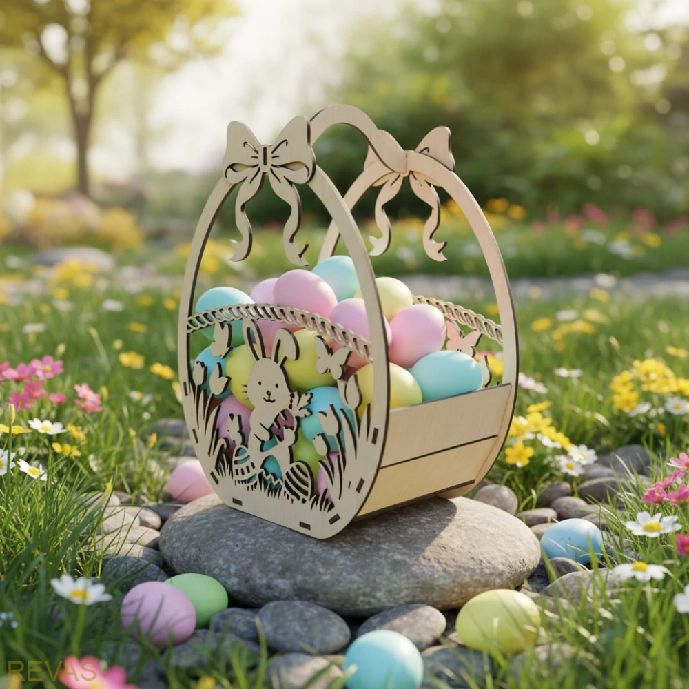 Velikonoční motiv je vyřezán do boků košíčku pomocí gravírování. Díky tomu vzniká jemný dekorativní vzor, který košíčku dodává originální vzhled.