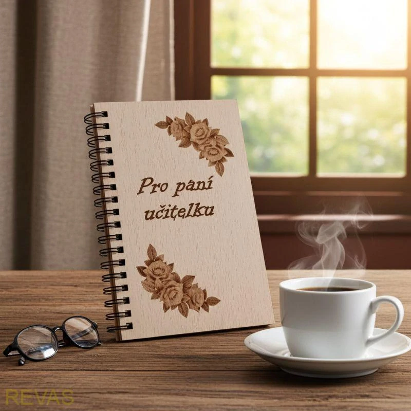 Zápisník s dřevěnými deskami a gravírováním pro paní učitelku
