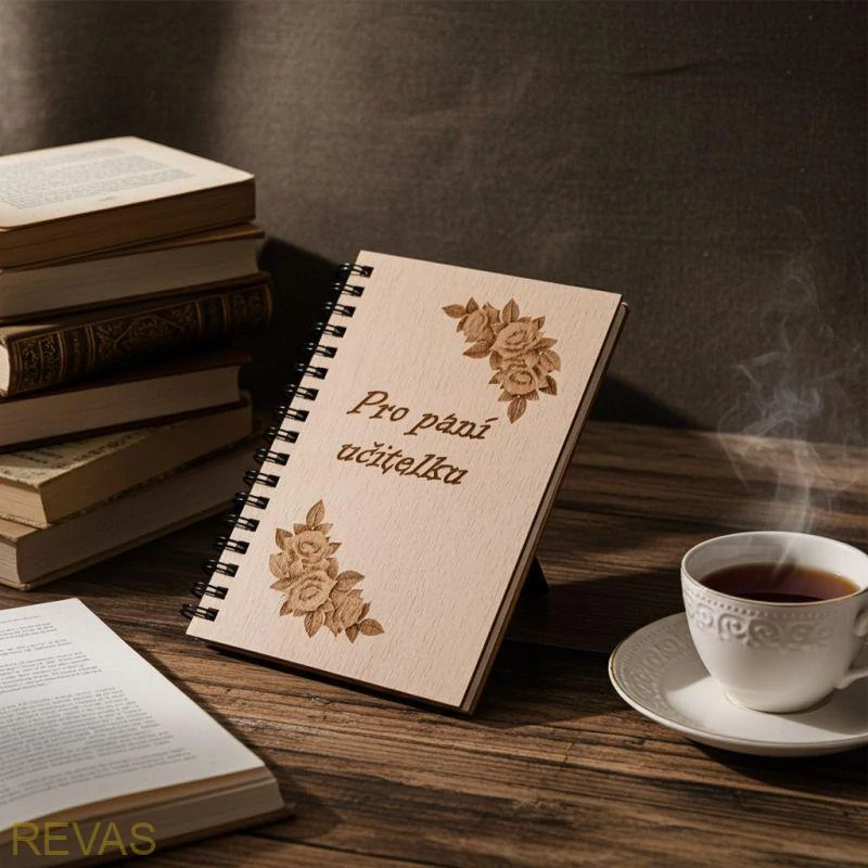 Zápisník s dřevěnými deskami a gravírováním pro paní učitelku