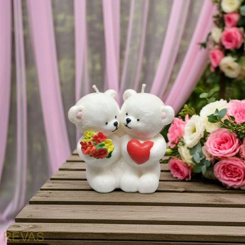 Svíčka ve tvaru zamilovaných medvídků symbolizuje něhu, blízkost a opravdové city. Detailně propracované postavičky – jeden medvídek s kyticí, druhý se srdcem – vytvářejí romantickou scénu, která potěší jako dárek k Valentýnu, výročí, svatbě, zásnubám nebo jen tak z lásky.
