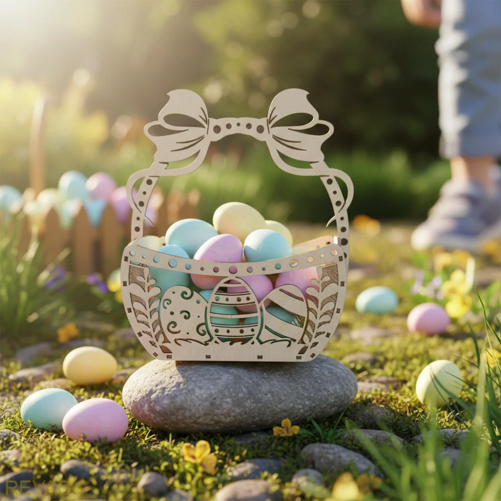 Velikonoční motiv je vyřezán do boků košíčku pomocí gravírování. Díky tomu vzniká jemný dekorativní vzor, který košíčku dodává originální vzhled.